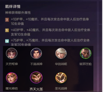 羁绊效果:①增加神将棋子双抗,坦度提升较大,②神将棋子普攻命中敌方就能给全员回血,增加团队续航能力。