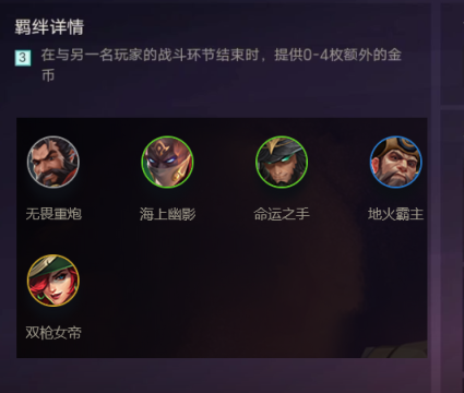 ①效果只要触发3豪侠羁绊,在战斗结束(不包括野怪),就能获得额外的0-4枚金币,我方多获取金币,而对手没有,我方就能形成经济优势,能更快的上人口搜到自己想要的卡组棋子。