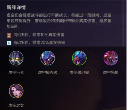 ①开局无效果,但5秒后虚空棋子就能造成额外的真伤(真伤无视护甲魔抗减伤),每过5秒就会叠加一次,可叠加5层,也就是说4虚空羁绊下虚空棋子在25秒后能造成额外100%真伤,如2星虚空恐惧技能伤害是400,释放一次技能就是400魔法伤害 400真伤共800伤害。