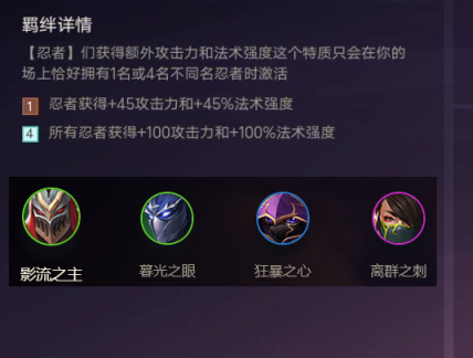 ②羁绊效果简单粗暴直接增加攻击力与法强。能极大增强忍者棋子的输出能力。