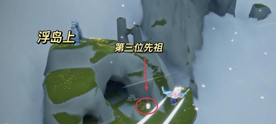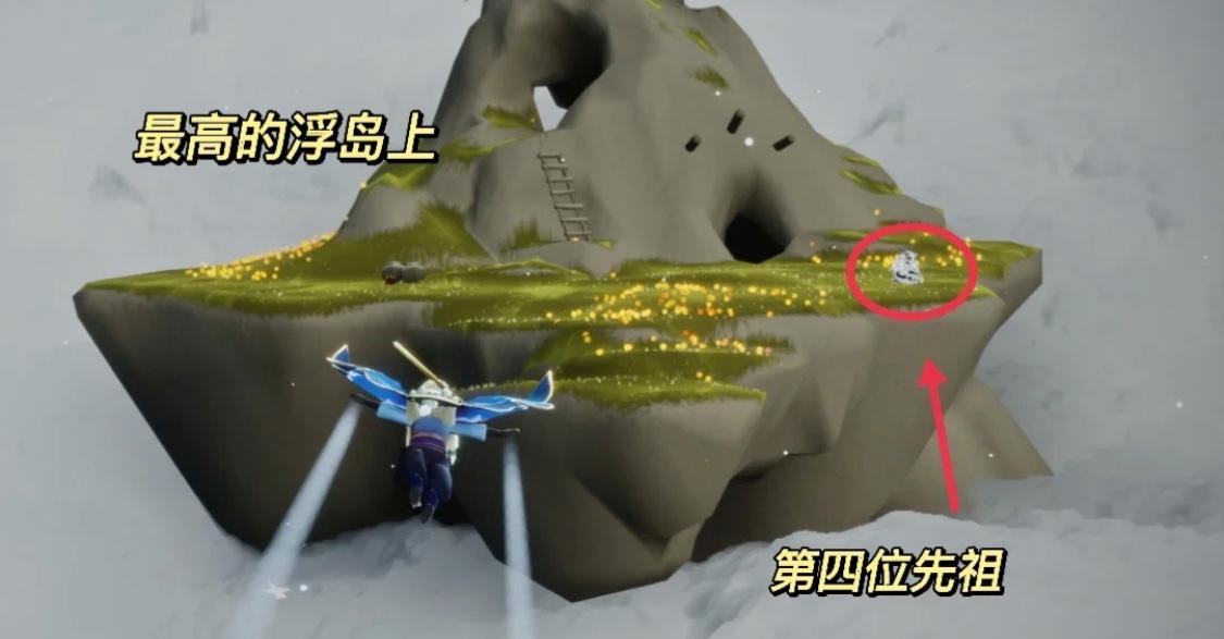 4、活跃领航员先祖,位置在飞行季地图内,主岛屿左边的最高的浮岛上,这个浮岛是最高的浮岛,还有一个小梯子。