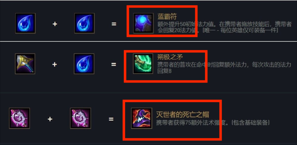 1.快速回复流:想要快速给队友回复血量,第一件必备蓝霸符,提高法力回复;第二件可以装备朔极之矛(回蓝刀),每次平A回复一定的法力,配合蓝霸符,进一步提高法力回复;第三件可以装备大帽子,提高血量回复效果。
