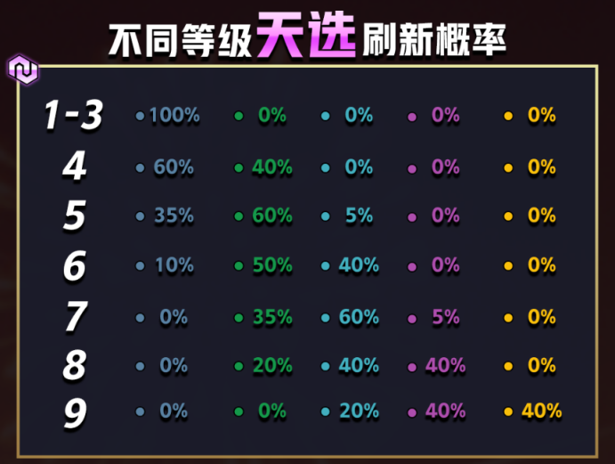 1、1/2/3级时各阶天选之人的出现率:100/0/0/0/0
