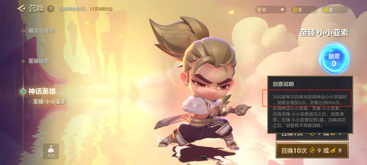 1.该英雄剑意注满需要600点,单抽一次是5点,600点就需要120次单抽,按照这个计算就需要108个神话召唤币。