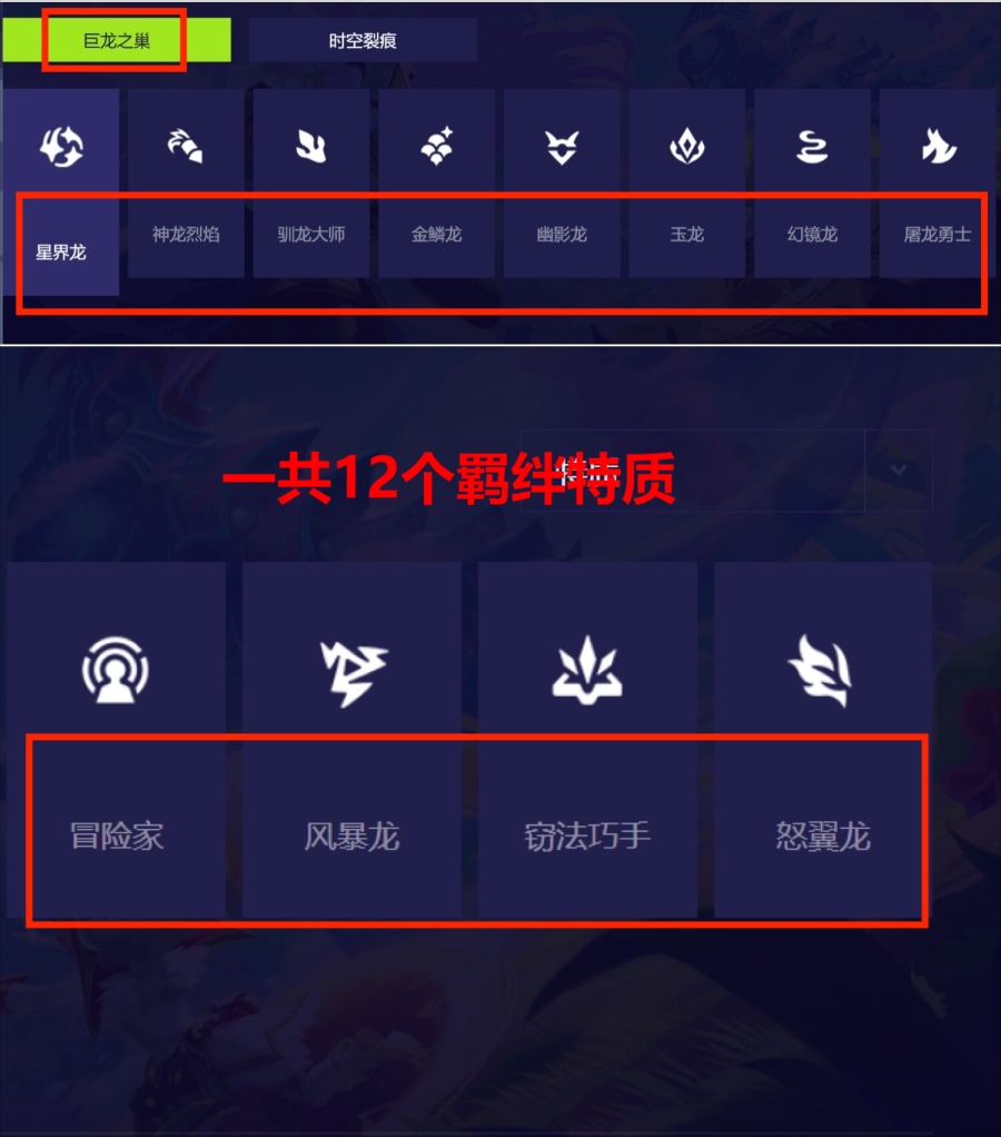 1.羁绊特质:羁绊特质有星界龙、神龙烈焰、驯龙大师、金鳞龙、幽影龙、玉龙、幻镜龙、屠龙勇士、冒险家、风暴龙、窃法巧手,怒翼龙,一共12个羁绊特质。