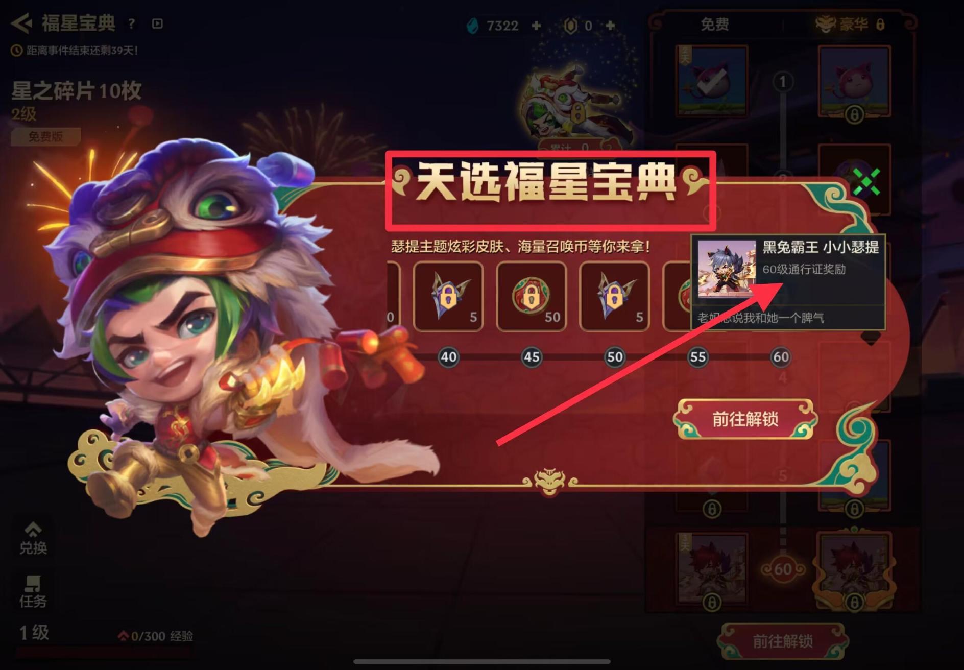 需要解锁豪华版福星宝典后,当宝典等级达到60级之后就可以领取黑兔霸王小小瑟提,如下图所示。