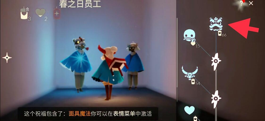 3、舞狮帽就在这些物品的最上方,只要解锁舞狮帽所在枝干的下面的物品,就可以用66根蜡烛兑换获得舞狮帽了。