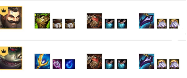 3、装备搭配:前排装备龙爪、棘刺背心、狂徒,给波比带过渡,后期给布隆。塔姆必备大天使之杖。只要塔姆来得早这局游戏直接起飞!
