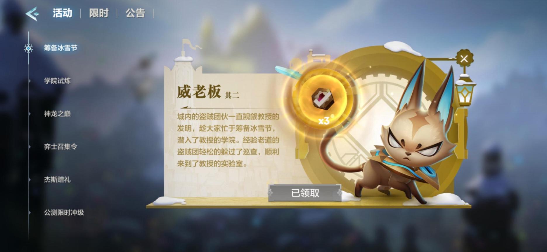 4、现在还有筹备冰雪节活动,完成后可以获得3个徽章盒,也就是9个徽章。