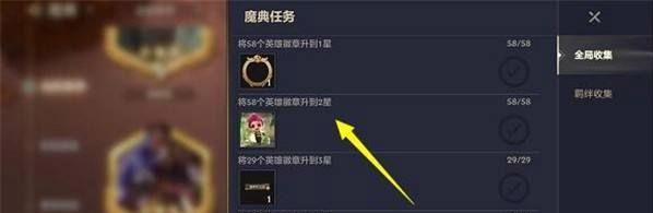 2、然后在魔典任务中,收集英雄徽章,把58个英雄徽章升到3星。