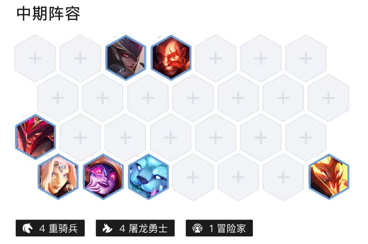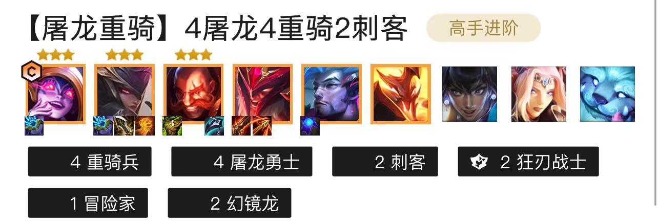 1、在金铲铲之战7.5赛季中 ,莉莉娅主c阵容是由4重骑兵、4屠龙勇士、2刺客、2狂刃战士、1冒险家、2幻镜龙组成。