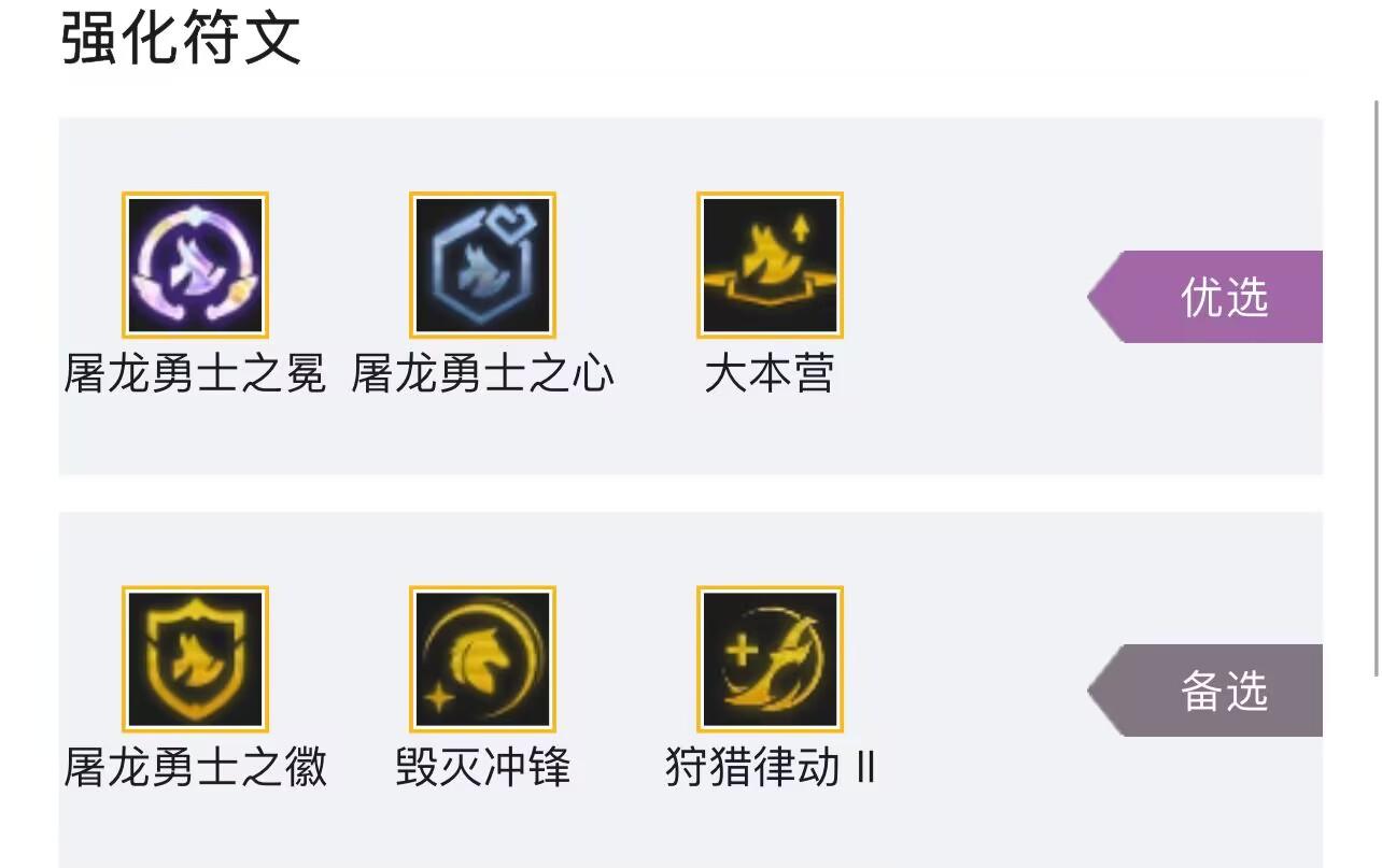 2、强化符文优选屠龙勇士之冕、屠龙勇士之心、大本营,备选屠龙勇士之徽、毁灭冲锋、狩猎律动2