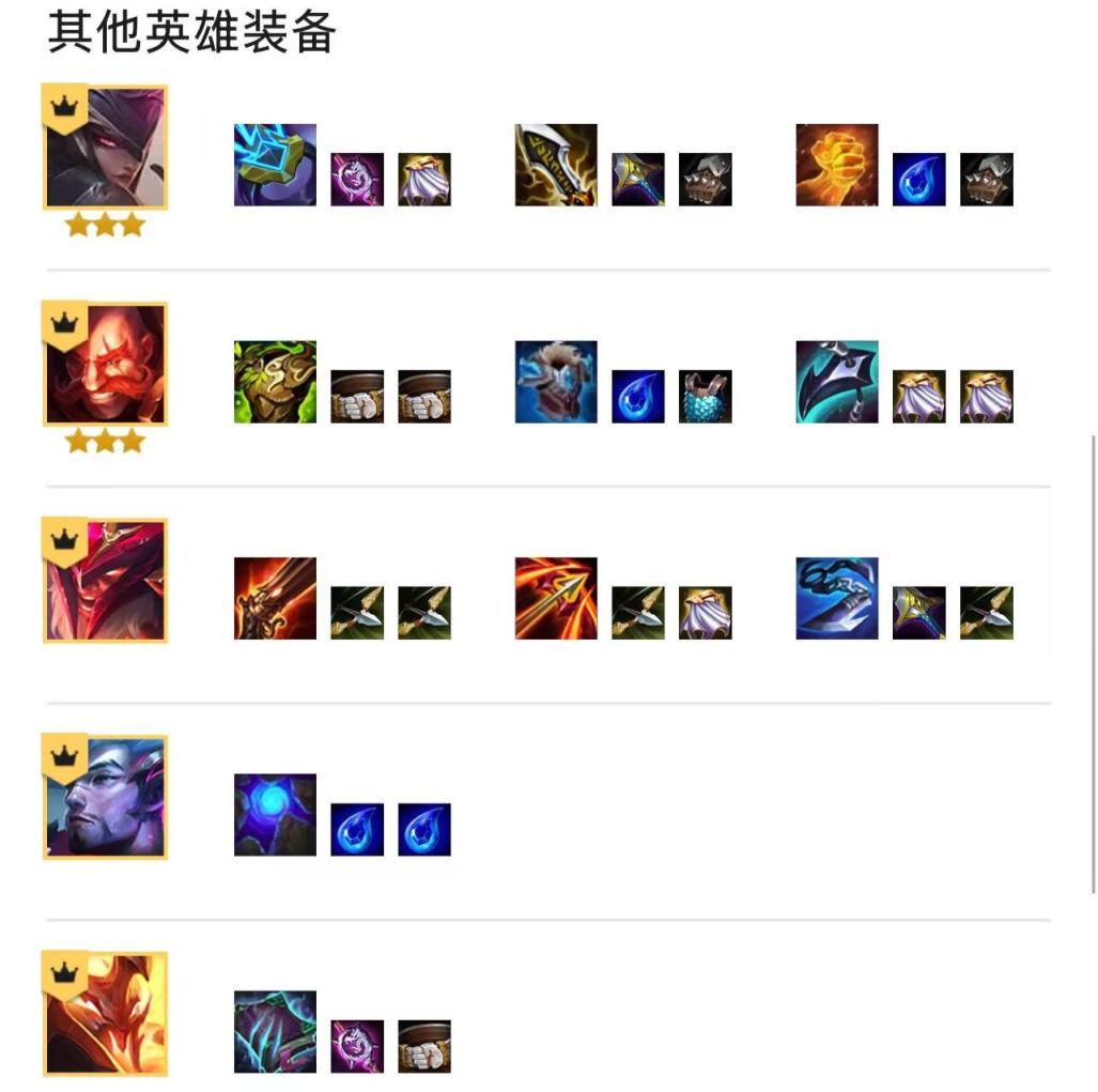 4、其他英雄装备:黛安娜的装备是离子火花、无尽、正义之手,布隆的装备是狂徒、冰心、巨龙之爪,奥拉夫的装备是火枪、卢安娜的飓风、巨杀,亚索的装备是蓝霸符,赫里卡姆的装备是莫雷洛法典。