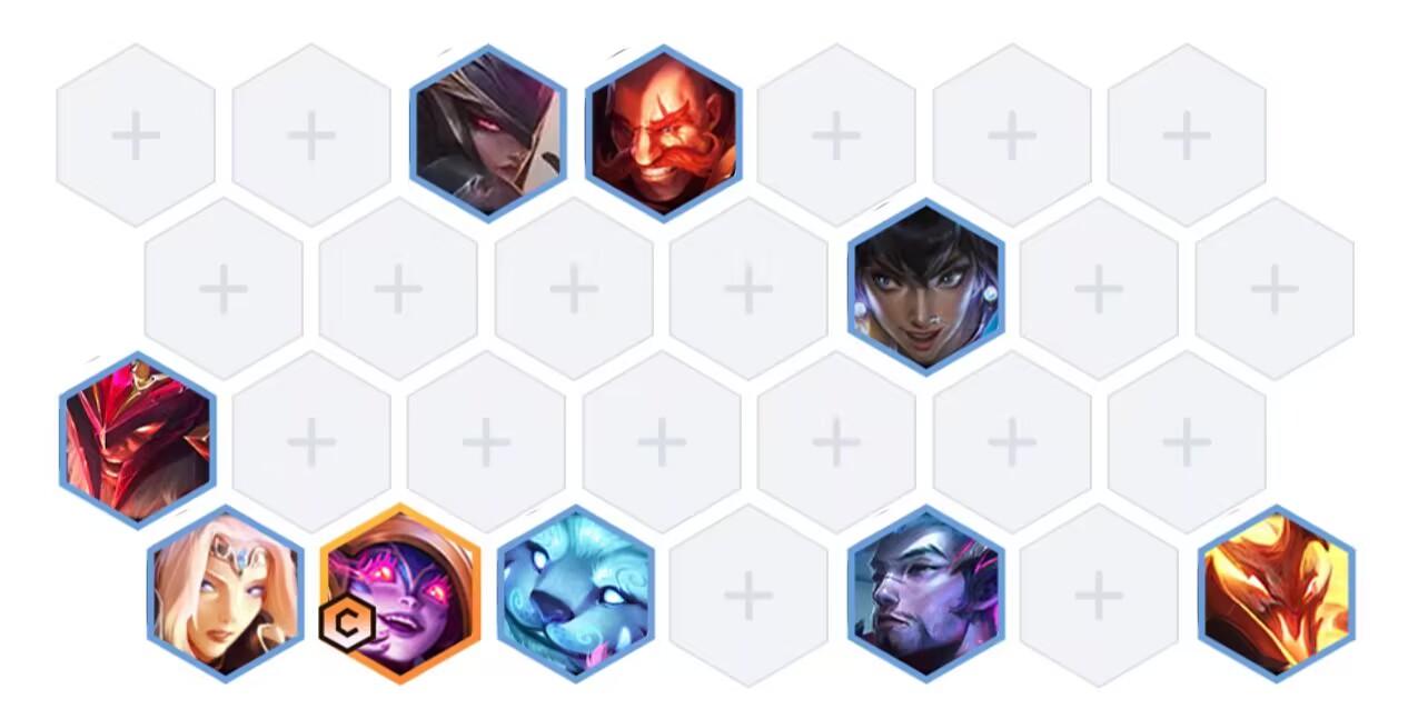 8、后期阵容:黛安娜、布隆在第一排抗伤,尼菈在第二排输出,奥拉夫在第三排输出,瑟庄妮、莉莉娅、努努、亚索、赫里卡姆在最后一排输出。