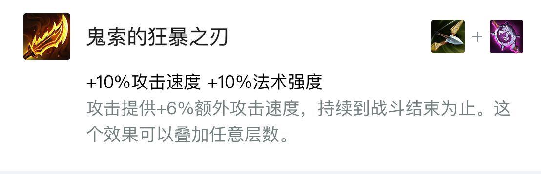 2、必备装备。鬼索的狂暴之刃。俗称“羊刀”配备该装备的目的是让黑默丁格攻击速度更快,攻击次数更多。