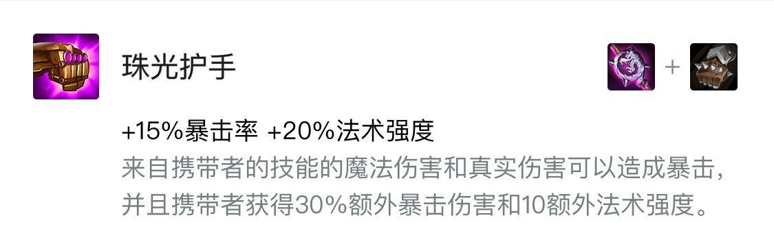 3、备选珠光护手,该装备使携带者释放的技能的魔法伤害和真实伤害可以造成暴击。配备该装备后可以使黑默丁格威力更大,灼烧更猛烈。