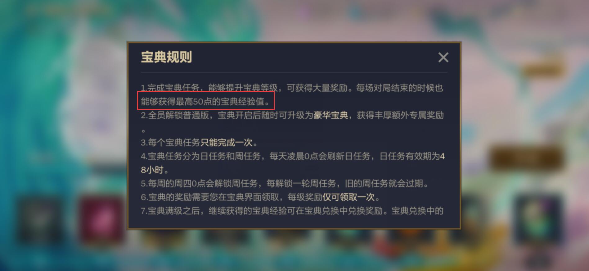 而每参与一场对局最多可以获得50点宝典经验,所以每天在进行9场对局(名次越高越好),这样一个月就可以肝满宝典了。