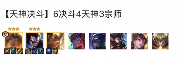 1.阵容推荐:天使,亚索,李青,永恩,慎,卡莉丝塔,刀妹,贾克斯,组成羁绊为6决斗4天神3宗师。
