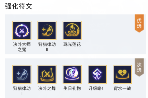 2.强化符文选择:优选决斗大师之冕,狩猎律动2,珠光莲花;次选狩猎律动1,决斗之舞,生日礼物,升级咯,背水一战。