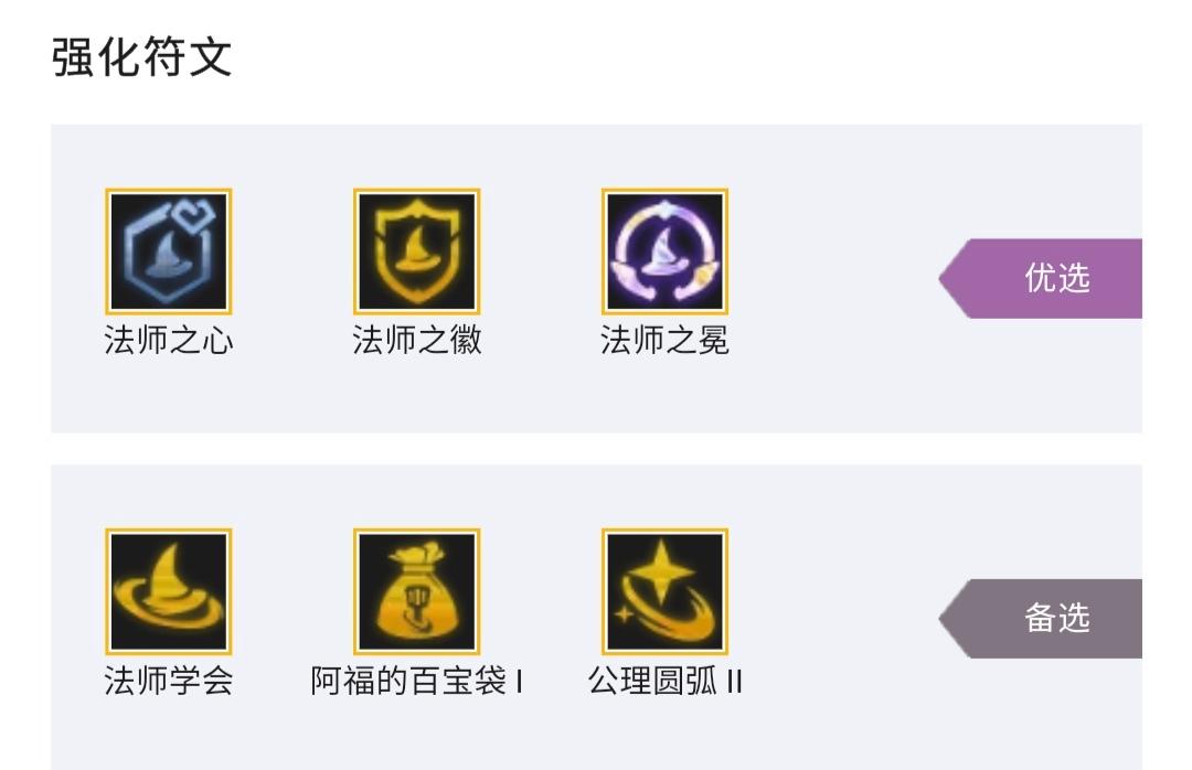 2.强化符文:优选法师转职类的强化符文,其次可以选法师学会,公理圆弧或者阿福的百宝袋拿金铲铲。