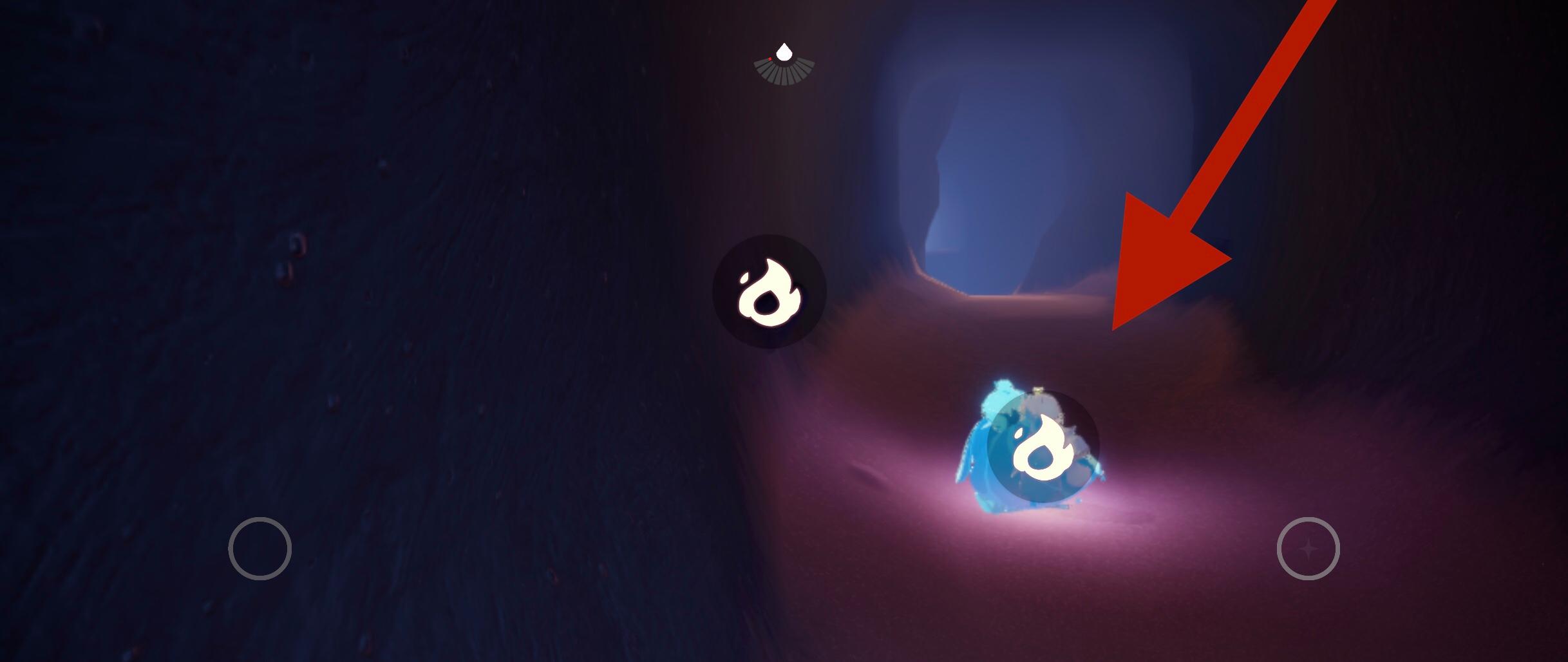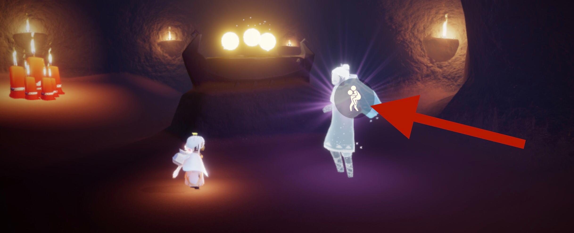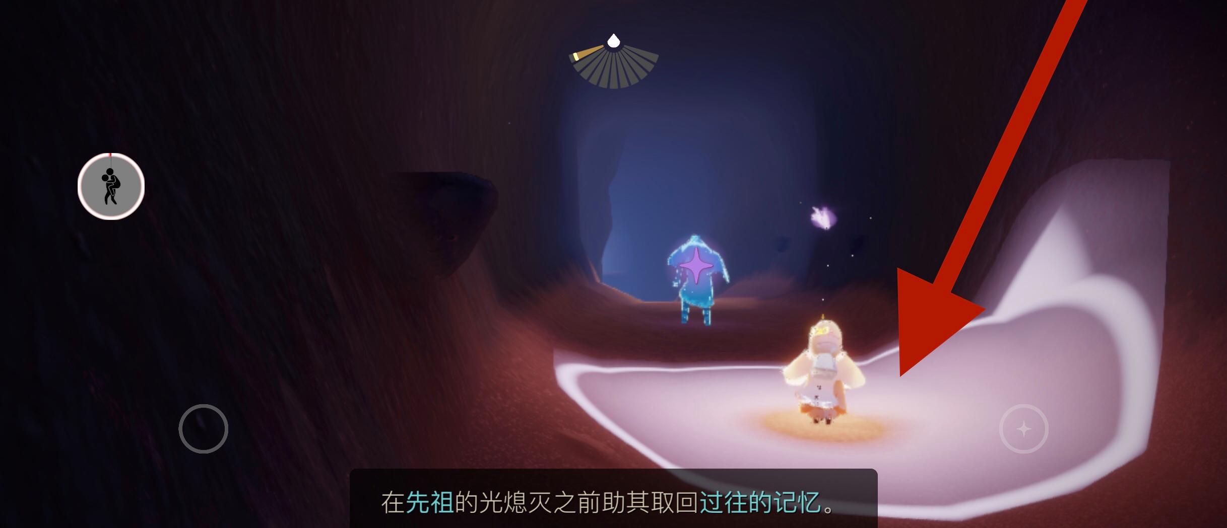 6、光圈运送完之后,在洞穴深处神坛前,再次点燃石像看完动画,就可以在先祖旁边看到背背按键,点击即可获得背背动作。
