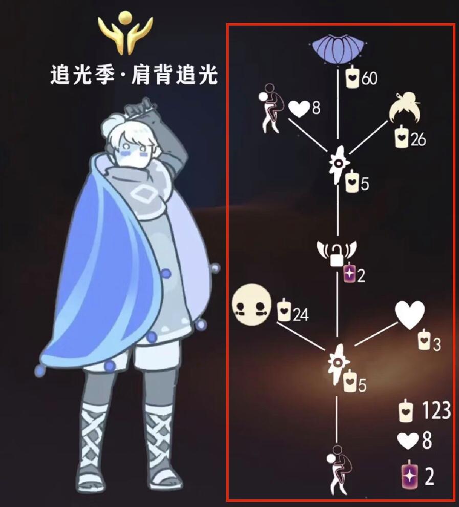 7、背背先祖复刻时,会出现在遇境的小池塘,到时候可以兑换更多物品,不亮灯泡斗篷60根白蜡烛,道姑发型18根白蜡烛,黑眼圈面具12根白蜡烛,随机魔法10根白蜡烛,一颗爱心3根白蜡烛,背背动作升级要6颗爱心,兑换大约共需要103白蜡烛,2根升华蜡烛,6颗爱心。