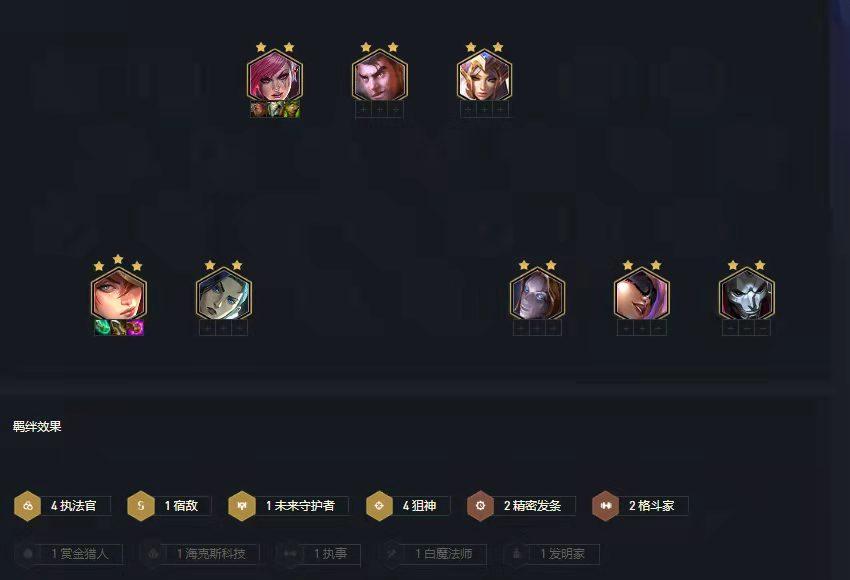 2、阵容介绍:执法斗士狙神是一套非常强势的上分阵容,配合上凌风,能够开局瞬间控制敌方多名棋子,从而让女枪开开心心的放技能,轻松的击败对手。特别是真实执法海克斯强化的加强,更是让这套阵容如虎添翼,前期拿到这个海克斯,直接玩这套阵容,女枪能三星就靠女枪输出,女枪不能三星,就靠二星杰斯或泽丽输出,如果有狙神转职,搭配给杰斯,更是强的不行。