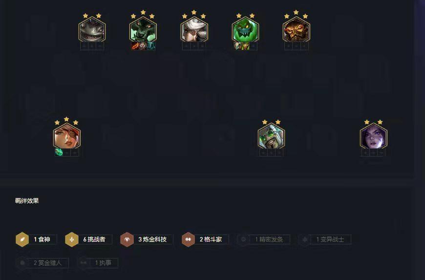 2、阵容介绍:新晋赌王阵容,只要前期有反曲弓,基本上可以无脑冲。如果没有同行,就赌三星狼人、奎因和其他棋子,如果有同行或有挑战者转职,可以上8人口,凑6挑战或8挑战,玩进阶阵容,强度很高。