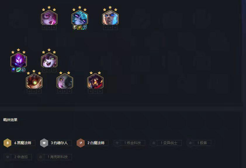 2、阵容介绍:黑白魔法师的阵容组成和搭配方式非常的多样,核心棋子也不固定,在游戏中,根据海克斯强化和装备合理的调整即可。不过这套阵容在当前版本也比较热门,如果同行太多的话,很容易被卡住,非常难受,所以想要上分的话,还是要根据局势合理的选择与调整。