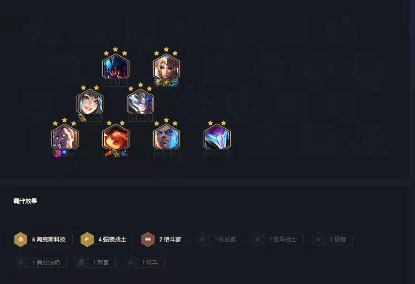 2、阵容介绍:版本更新后,这也让海克斯强袭战士阵容的强度有所回升,由于技能的调整,所以现在给希维尔搭配暴力输出装,能够最大化的提升阵容整体战斗力,遇到合适的海克斯强化或装备,可以选择这套阵容,相对比较冷门,而且战斗力也还不错,用来上分是完全没有问题的。