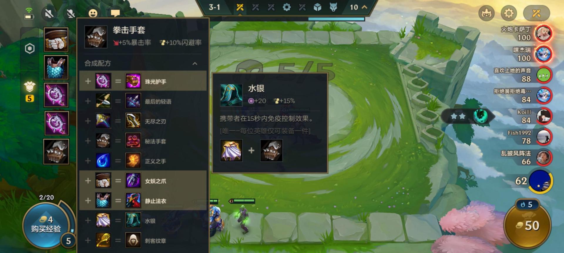 1、水银是一件非常实用的免控装备,在金铲铲之战中很多棋子都是有控制技能的,一秒到几秒不等。装备水银之后所有的控制技能效果都将会失效。但是要注意的是控制效果虽然不在了但是伤害还是会有的。所以常规情况下我们都会给一些高输出的棋子带水银,这样就可以在15秒内持续输出避免被对方控制技能眩晕或不能攻击的状态了。