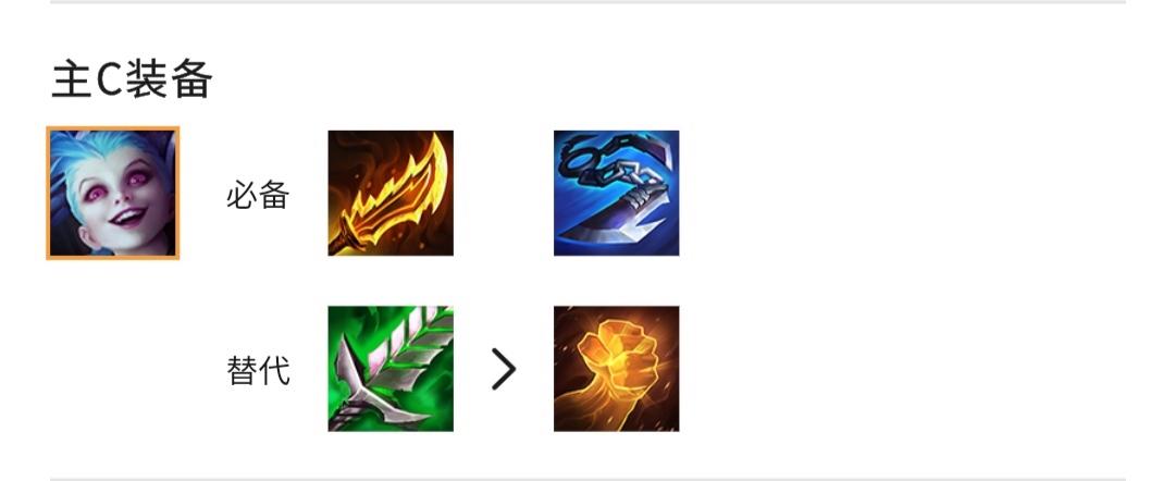 2.该阵容主C金克丝的必备装备为鬼刀和巨杀,第三件装备为饮血剑或者正义之手提高金克丝续航能力。