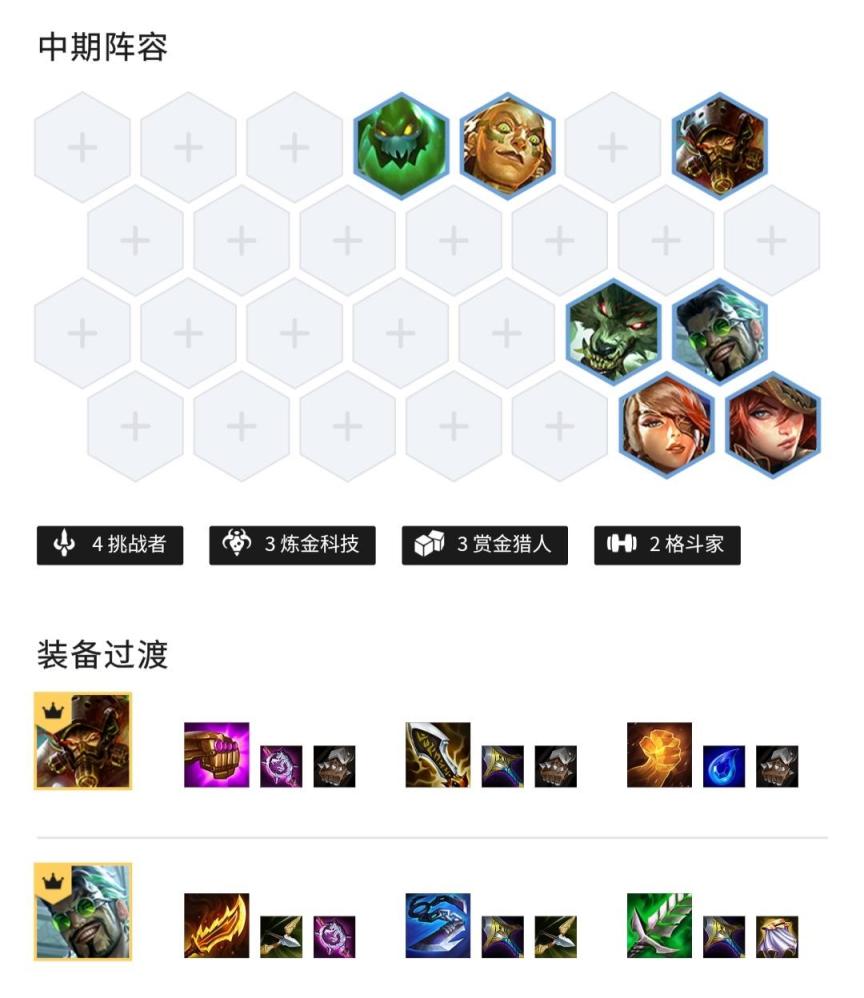 10.中期阵容以4挑战者,3炼金,3赏金和两格斗家过渡,其次将主C和副C的装备给蛮子和德莱文。