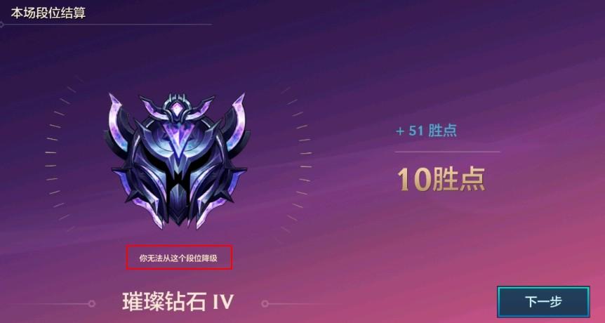 金铲铲之战一旦到了钻石段位就不会掉到钻石段位以下了,玩家在晋级钻石段位的时候,段位结算界面会明确提示玩家“你无法从这个段位降级”。其实不仅是钻石,金铲铲之战在钻石以前只要到了对应的大段位就不会降级了到更低段位了。玩家只有在大师II以上段位,才会降级到大师II。
