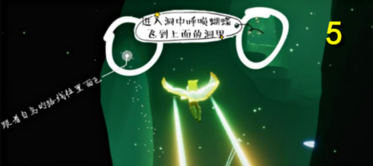 7、树洞之中,呼唤出蝴蝶之后,在正西侧偏僻的角落,会发现一群徘徊的蝴蝶,那里是一处隐藏的新增光翼位置,蝴蝶围绕那个位置徘徊转圈,很明显,因为其他的蝴蝶都是漫无目的的飞。