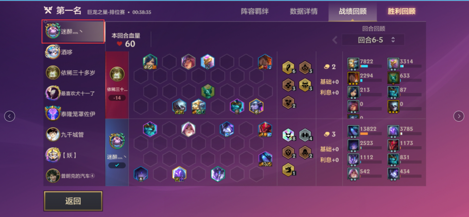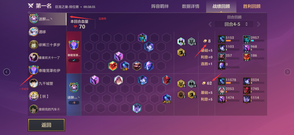 1、下面是一场我登顶的游戏记录,箭头指向的那个敌人明显就是没有把握好游戏节奏,在游戏中期花费大量金钱去提升英雄强度。当时确实厉害,谁也打不过他。但是他的经济差下好多。我利息每回合得5金币,他的连胜只有1金币,到了后期我可以用更多的钱去提升强度,而他可能刷出10费卡都买不起。
