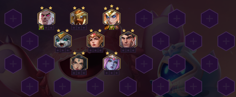 1.组成(1)凤黯、星龙战神、逆鳞战姬、狻猊之心、曙光神将、未来守护者、西斗之飒、蛛后(2)2龙 2护卫 6换形师 2仙灵 2狂野(3)2龙:龙获得50%魔法抗性(4)2护卫:在战斗环节开始时,所有护卫提供40护甲给邻近的友军,这个护甲可以叠加(5)6换形师:换形师变身时获得90%额外最大生命值(6)2仙灵:仙灵单位的普攻有40%几率减少目标20发力并回复自身30法力值(7)2狂野:狂野单位攻击生成怒气层数(仅限狂野单位友军)2.出装(1)逆鳞战姬:羊刀、飓风、反甲、狂徒(2)凤黯:多余肉坦与法强装备(3)纳尔:多余攻速装备3.站位