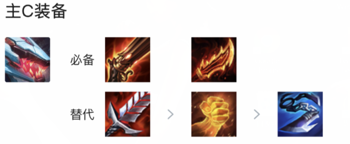 3.装备推荐:主c鳄鱼装备必备火炮和羊刀,第三件优先饮血剑,没有的话正义之手或者巨杀都是可以的。