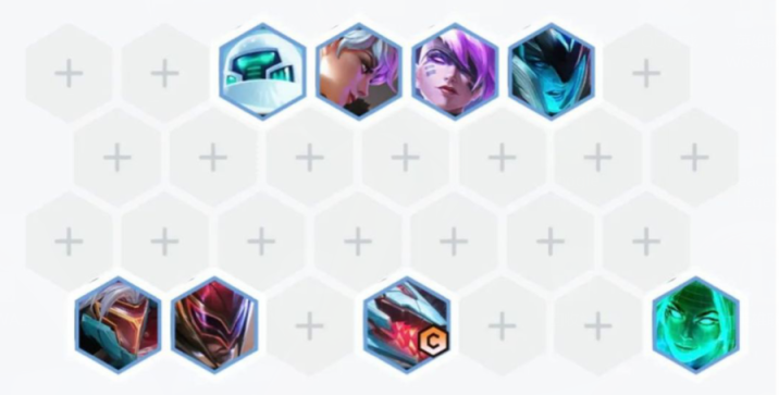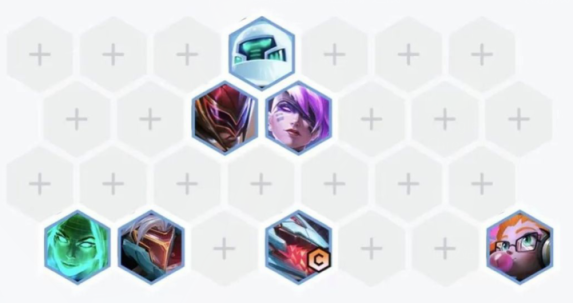 6.中期阵容:机器人,蔚,李青,乐芙兰,劫,鳄鱼,佐伊,组成4斗士3黑客2AI程序。