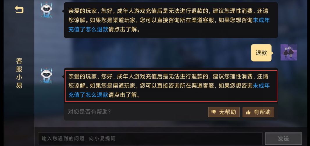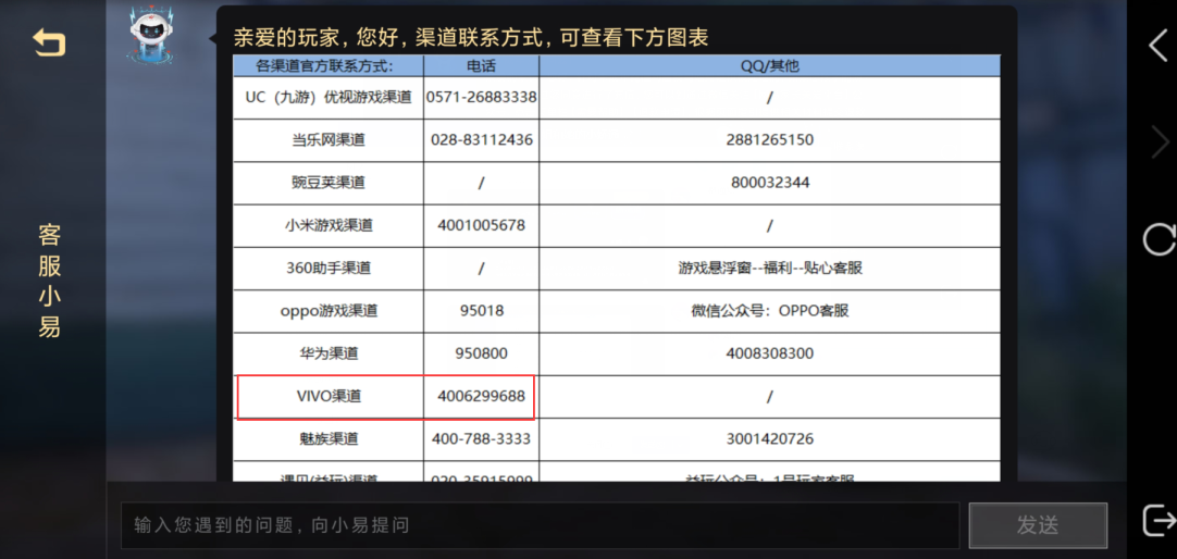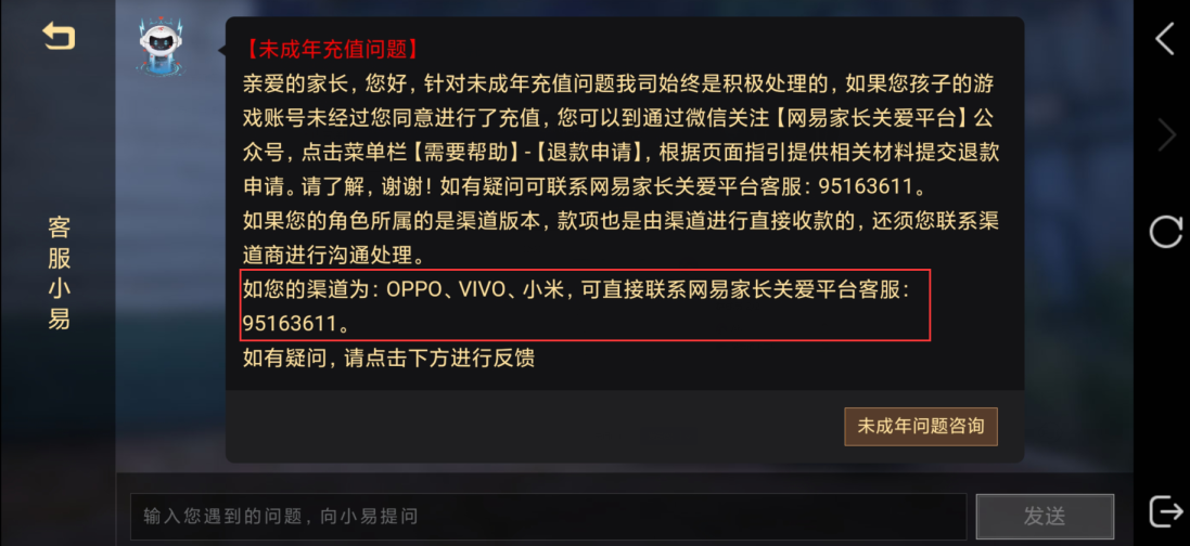 而玩家输入未成年充值问题可知,如果玩家的角色所属的是渠道版本,款项也是由渠道进行直接收款的,还须玩家联系渠道商进行沟通处理。但是vivo可以联系网易家长关爱平台客服(电话:95163611)