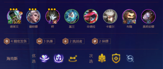 1、首先是以德莱文为主C的4精密3执事2保镖阵容,德莱文二星基本就稳了,如果三星的话基本必然吃鸡。