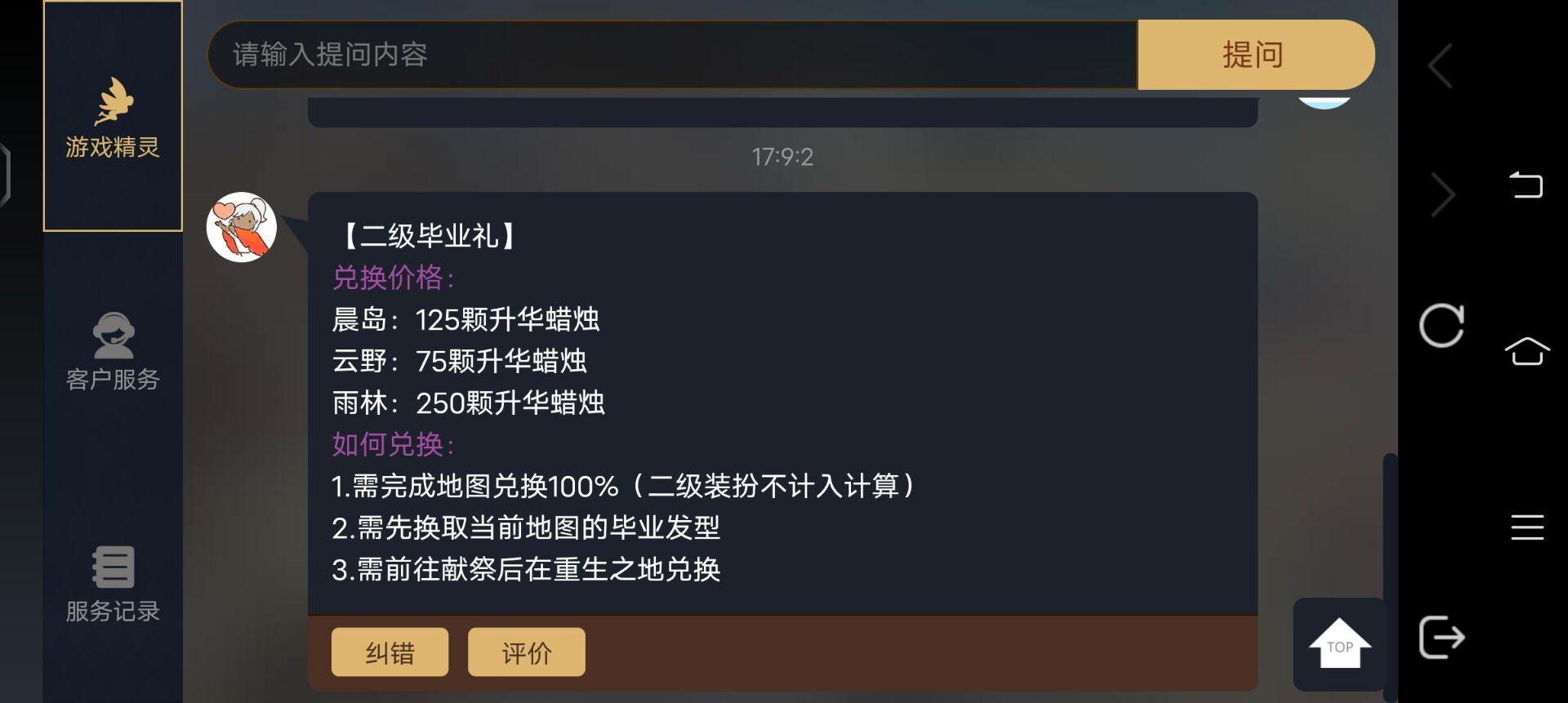 国服二级毕业礼已经出来了,但是目前只出了晨岛、云野、雨林的二级毕业礼,其他地图还没出来,兑换方式是需完成地图兑换100% (二级装扮不计入计算)和需先换取当前地图的毕业发型,兑换地点需前往献祭后在重生之地兑换。
