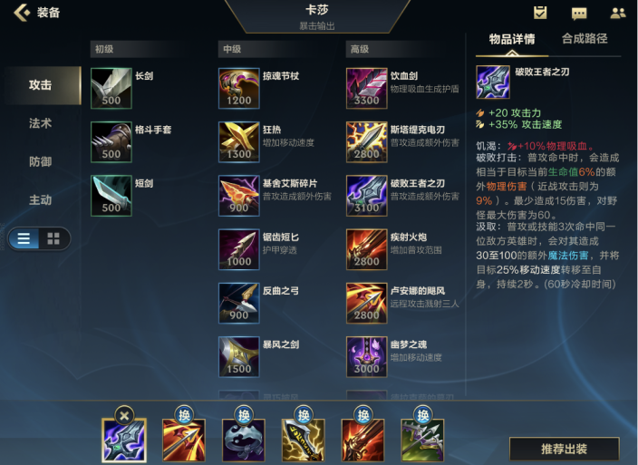 1、首先将破败王者之刃做出来,破败是卡莎的核心装备。
