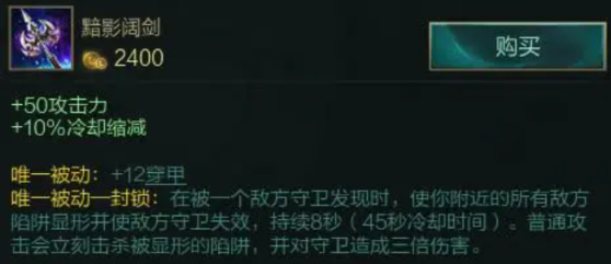 1、在手游中塞纳的核心装备是暗影阔剑,它是塞纳第一件要出的装备,首先是它的属性非常符合塞纳,增加攻击力和冷却缩减,而且被动可以周期性的暴露敌方视野,起到排眼的作用;