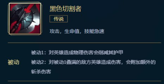 3、第三件选择黑切,塞纳的平A和技能可以很好的叠加黑切的被动效果,削弱敌方的护甲,可以让队友打出更高的伤害;