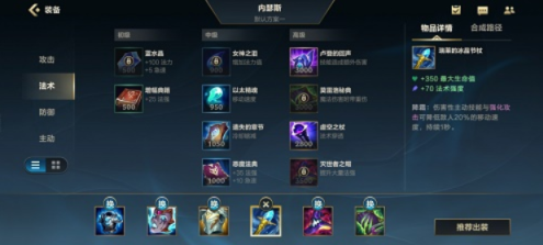二、第一件推荐芬布尔之冬(装备升级获得),出门出蓝宝石,然后再合成水滴,这样可以让你有消耗的资本。最后,再合成大件(提供350生命值1200法力值10技能急速),而装备被动最重要:增加技能急术和返还法力值,另外使敌方英雄减速时还会获得护盾(只有15秒的冷却);