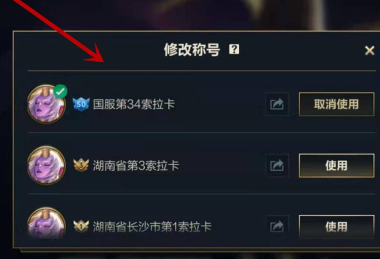 4.选择使用地区排名称号,如图,设置后在对战中即可显示地区排名或英雄排名。