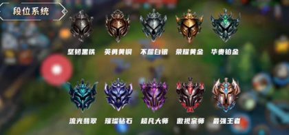 ①段位由低至高为:坚韧黑铁、英勇黄铜、不屈白银、荣耀黄金、华贵铂金、流光翡翠、璀璨钻石、超凡大师、傲世宗师、最强王者。