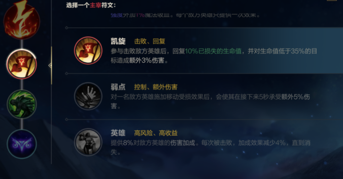 ②主宰符文选择 凯旋 参与击败敌方英雄后,回复10%已损失的生命值,并对生命值低于35%的目标造成额外3%伤害。