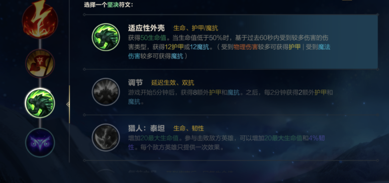 ③坚决符文选择 适应性外壳 获得50生命值。当生命值低于50%时,基于过去6O秒内受到较多伤害的伤害类型,获得12护甲或12魔抗。(受到物理伤害较多可获得护甲|受到魔法伤害较多可获得魔抗)